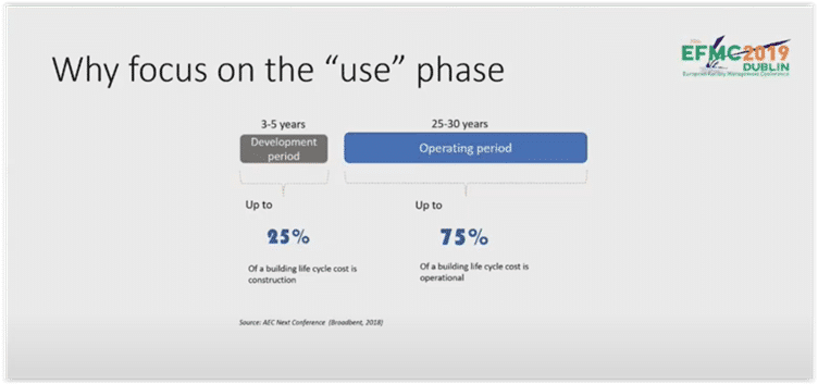 Simon Ashworth, ricercatore dell’Università di Zurigo di Scienze Applicate, spiega perché è necessario focalizzarsi anche e soprattutto sulla fase di gestione a motivo dei dati presentati alla AEC Next Conference del 2018 e riportati nell’immagine che segue, secondo i quali i costi di gestione rispetto al totale ammontano al 75%. Per altri autori si arriverebbe addirittura all’85% (cfr. Kutaiba Azmeh e Kwok Chuen Liu, Research on Bridging the Information Gap of BIM of interoperability and integration in Facilities Management, Gothenburg, Sweden 2021).