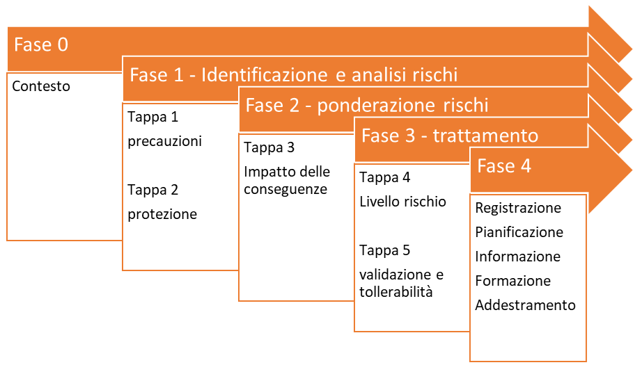 La fase 1, di identificazione e analisi dei rischi, attrae a sé la tappa della definizione delle precauzioni e delle misure di protezione.