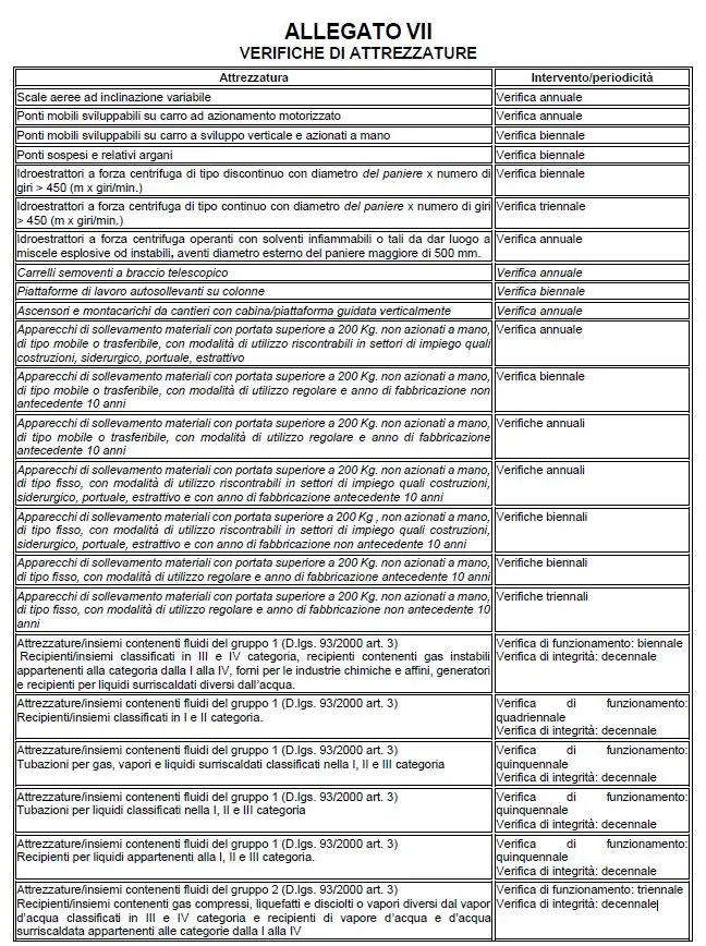 Allegato VII, D.Lgs. 81/08 – Verifiche di attrezzature.
