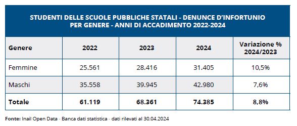 I dati sugli infortuni nelle scuole nel 2024