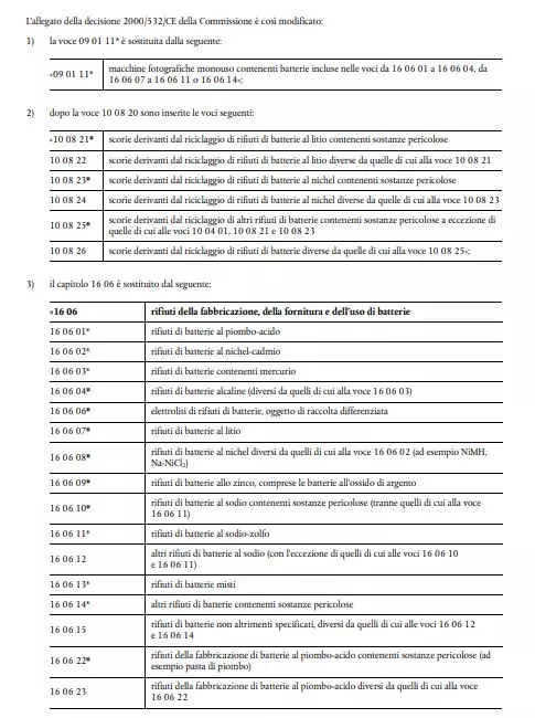 Questi cambiamenti hanno determinato pertanto l’esigenza di aggiornare l’elenco dei rifiuti previsto dalla decisione 2000/532/CE per “tenere conto delle nuove composizioni chimiche delle batterie e della gestione dei rifiuti di batterie, di un mercato delle batterie in evoluzione e per migliorare l’individuazione e la classificazione dei relativi flussi di rifiuti, nonché per favorire un miglioramento della cernita, del riciclaggio e della comunicazione dei rifiuti di batterie”.